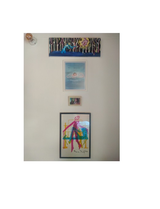 - El último, se supone, es una copia de una ilustración de Kafka, y, aunque la he mirado por años, no sé que pienso cuando la veo. Miro la posición de las personas, superpuestas en el centro, como si fueran un efecto de espera y desesperación. Por el movimiento quieto. Miro las caras inexpresivas hacia el suelo. Pero también veo el color, vivo, variado. No sé nada de la técnica. Y no sé qué quiere decir. Pero mirarlo, y narrármelo, es suficiente. Me lo regaló mi hermano, también. No puedo ver ese cuadro sin sentir cariño.